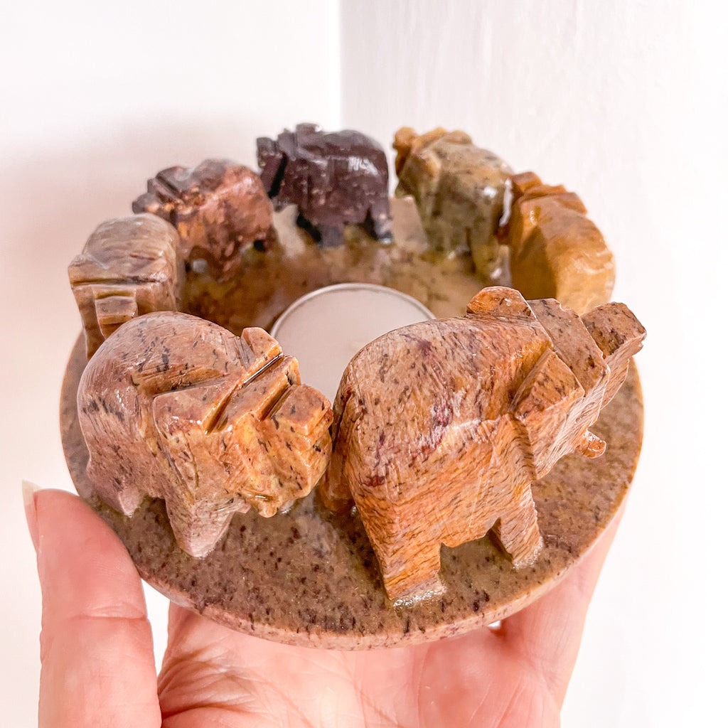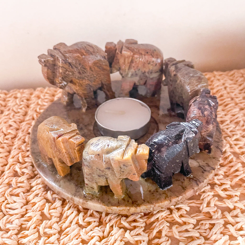 This circle of elephants made of crystal soapstone has a holder in the centre for incense or a candle.