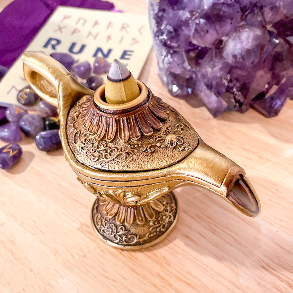 Place an incense cone at the top of this genie lamp incense burner and watch the smoke gently come out of the spout like a genie is going to appear at any moment.