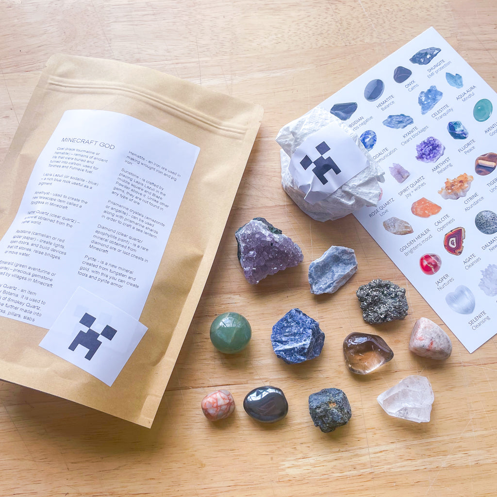 Minecraft Pro Set: 8 crystals - such as Lapis Lazuli (or sodalite), Nether quartz (clear quartz), Coal (Black Tourmaline or obsidian), Redstone (carnelian, jasper or Red Agate), Amethyst, Hematite, Emerald (or green aventurine), & Sunstone.