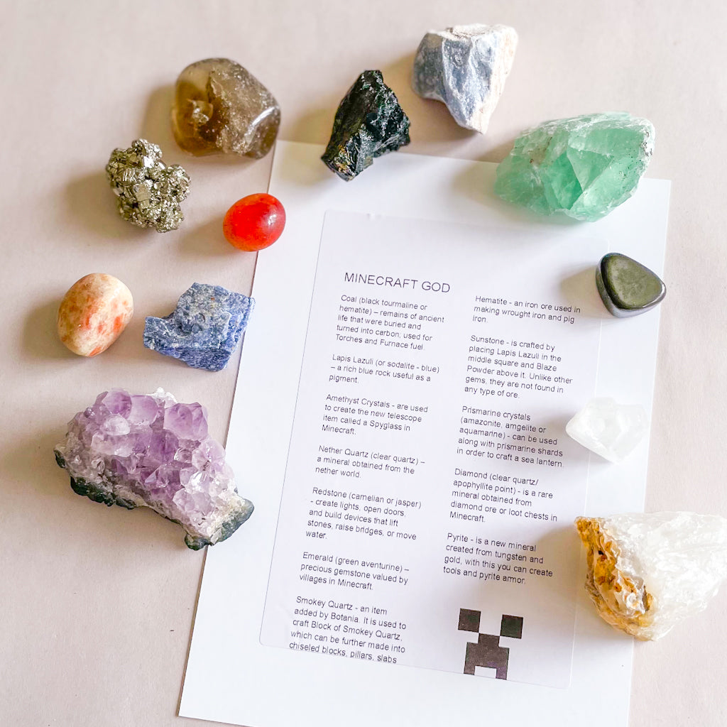 Minecraft God Set: 12 crystals - such as Lapis Lazuli (or sodalite), Nether quartz (clear quartz), Coal (Black Tourmaline or Obsidian), Redstone (carnelian, jasper or Red Agate), Amethyst, Hematite, Emerald (or green aventurine), Prismarine crystals (amazonite, angelite or aquamarine), Smokey Quartz, Pyrite, Diamond (clear quartz or apophyllite point) & Sunstone.