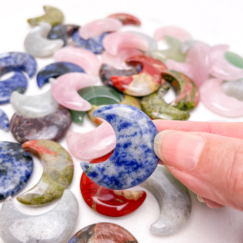 Crystal moon could be: clear quartz, rose quartz, dragon blood stone, Lapis lazuli, Fluorite, sodalite, labradorite, smoky quartz, agate, aventurine, Rhodonite, Tiger eye, jasper, amazonite, Blue stone, gold stone, amethyst, obsidian, flower agate, opalite. Each crystal is unique and beautiful. The one pictured is an example and is not the actual crystal you will receive.