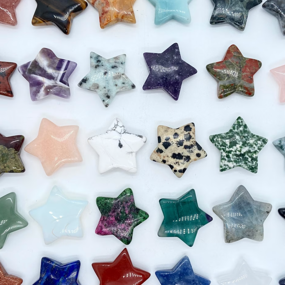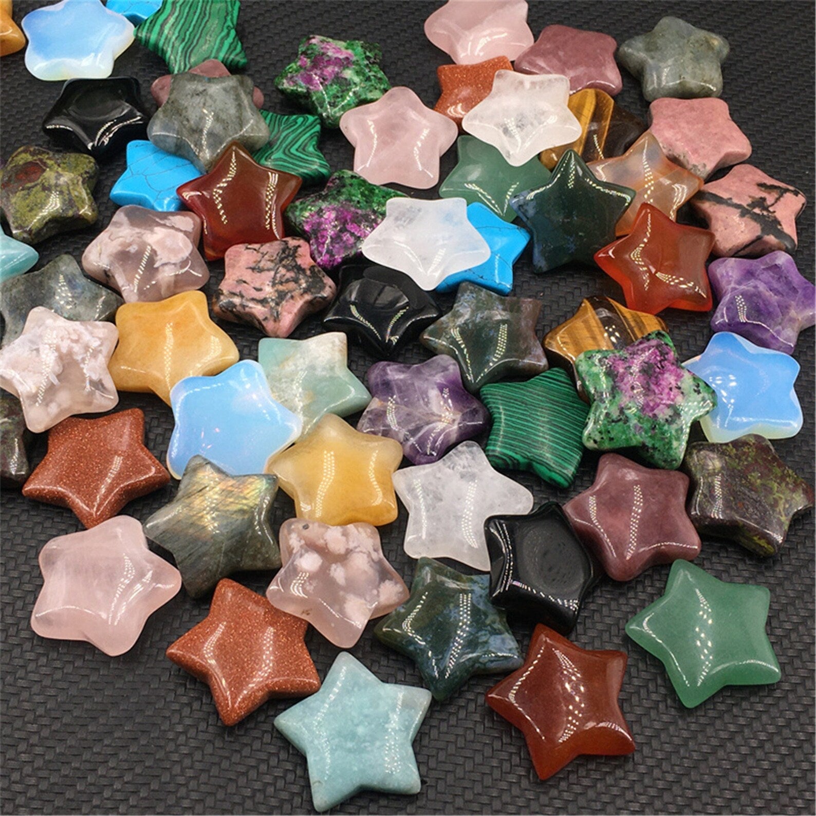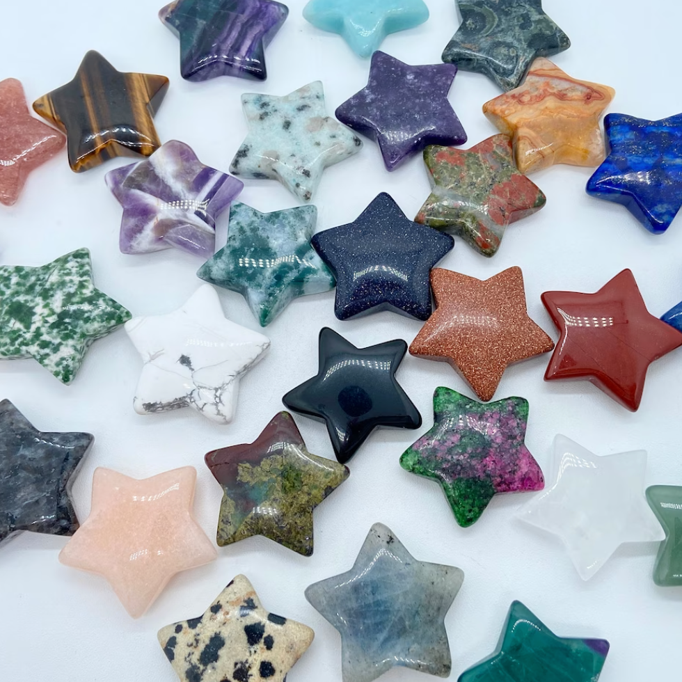 Crystal star could be: clear quartz, rose quartz, dragon blood stone, Lapis lazuli, Fluorite, sodalite, labradorite, smoky quartz, agate, aventurine, Rhodonite, Tiger eye, jasper, amazonite, Blue stone, gold stone, amethyst, obsidian, flower agate, opalite. Each crystal is unique and beautiful. The one pictured is an example and is not the actual crystal you will receive.