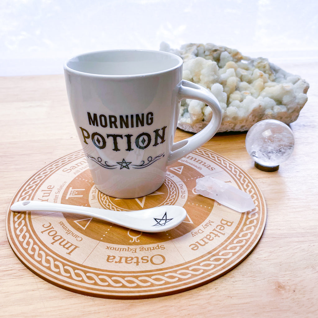 This bewitching mug and spoon set will add a pinch of magic to every cuppa. Style features 'Morning Potion' text and matching teaspoon with a pentagram design that fits perfectly in a slotted handle.