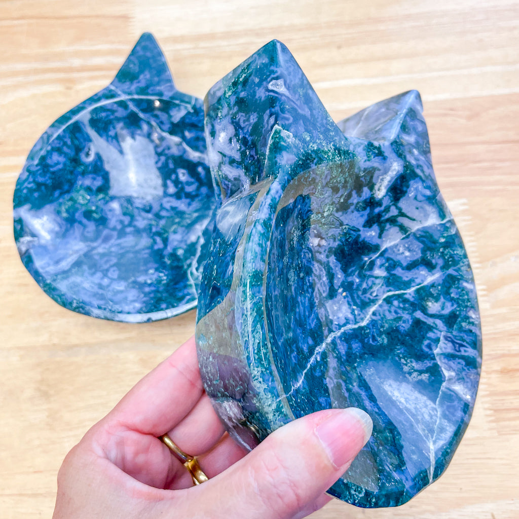 Purchase Moss agate crystal pussy cat shaped carved bowl large 1kg online now from Six things shop Australia.