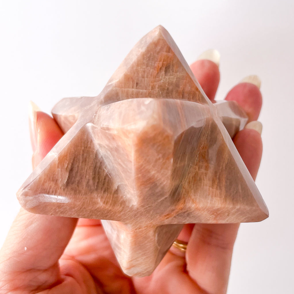 Experience the spiritual power of Merkabah with our Peach Moonstone Merkaba crystal.