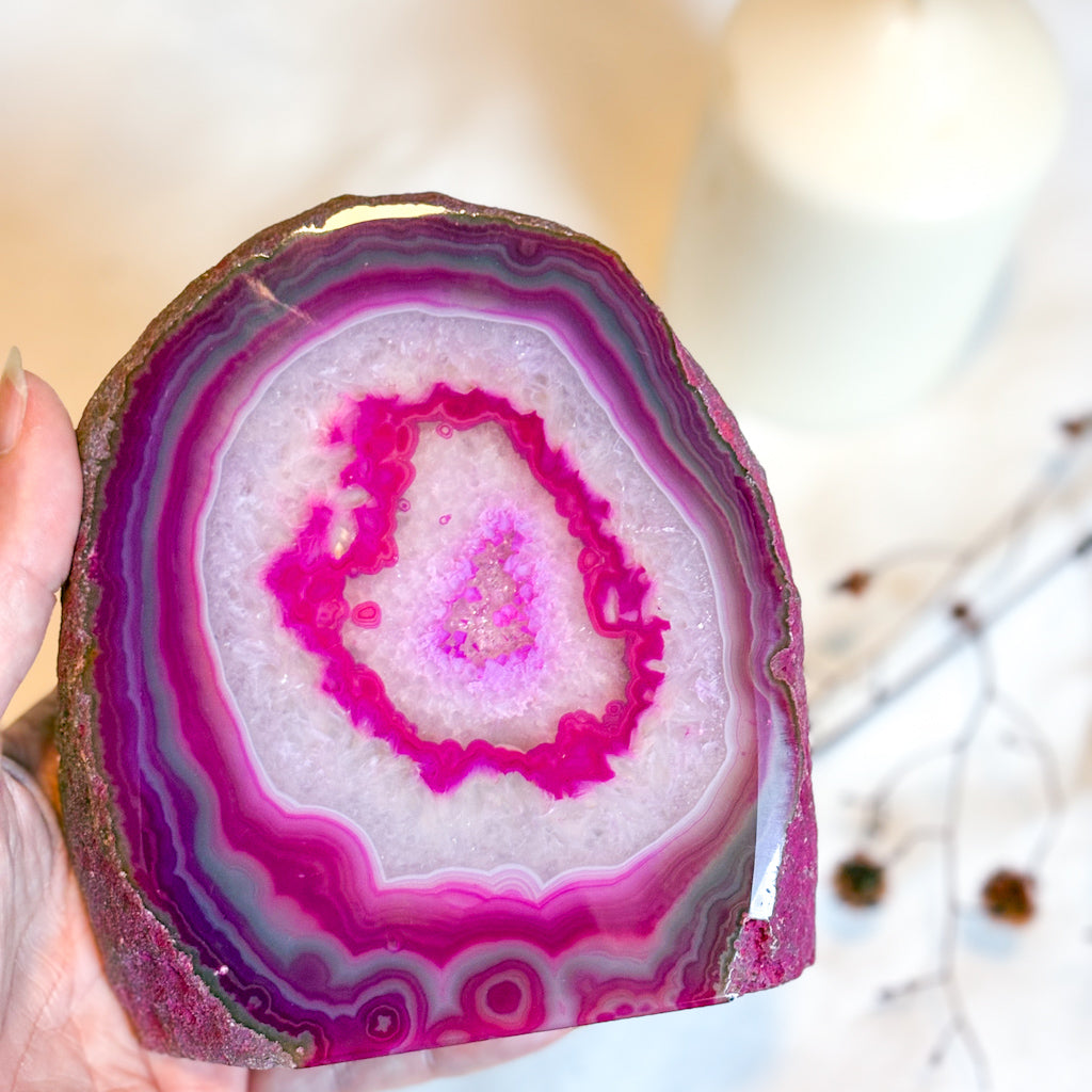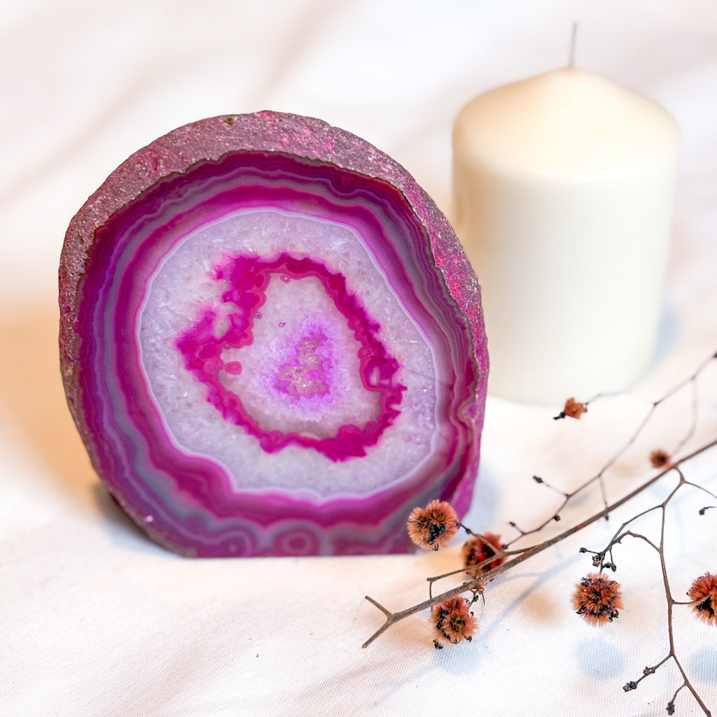 Agate crystals bring grounding, stabilize emotions, physical balance, and gentle soothing energy. Agate is a very fine grained form of Quartz. Formed by the cooling of volcanic lava, the Agate stone is then sliced in half and Artisans polish each one by hand, leaving the stony edge untouched. Agate quartz is known for it’s strength and balancing qualities, so is a great stone to have within your home or to give as a gift. Some have a polished clear quartz centre.