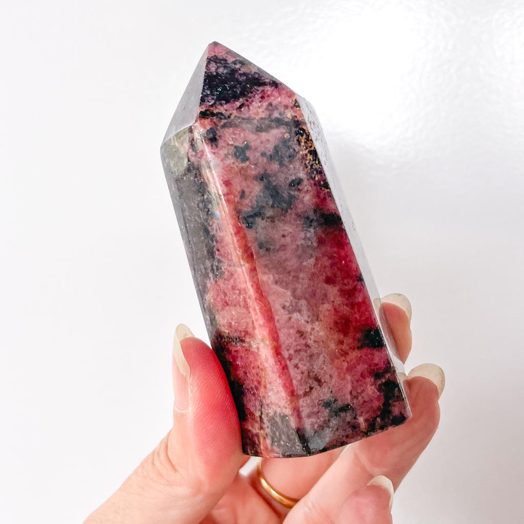 This Rhodonite wide point tower is a powerful emotional healer during stressful times. It’s soothing energy can help heal heartbreak and turn toxic emotions like jealousy, anger and resentment into forgiveness and compassion.