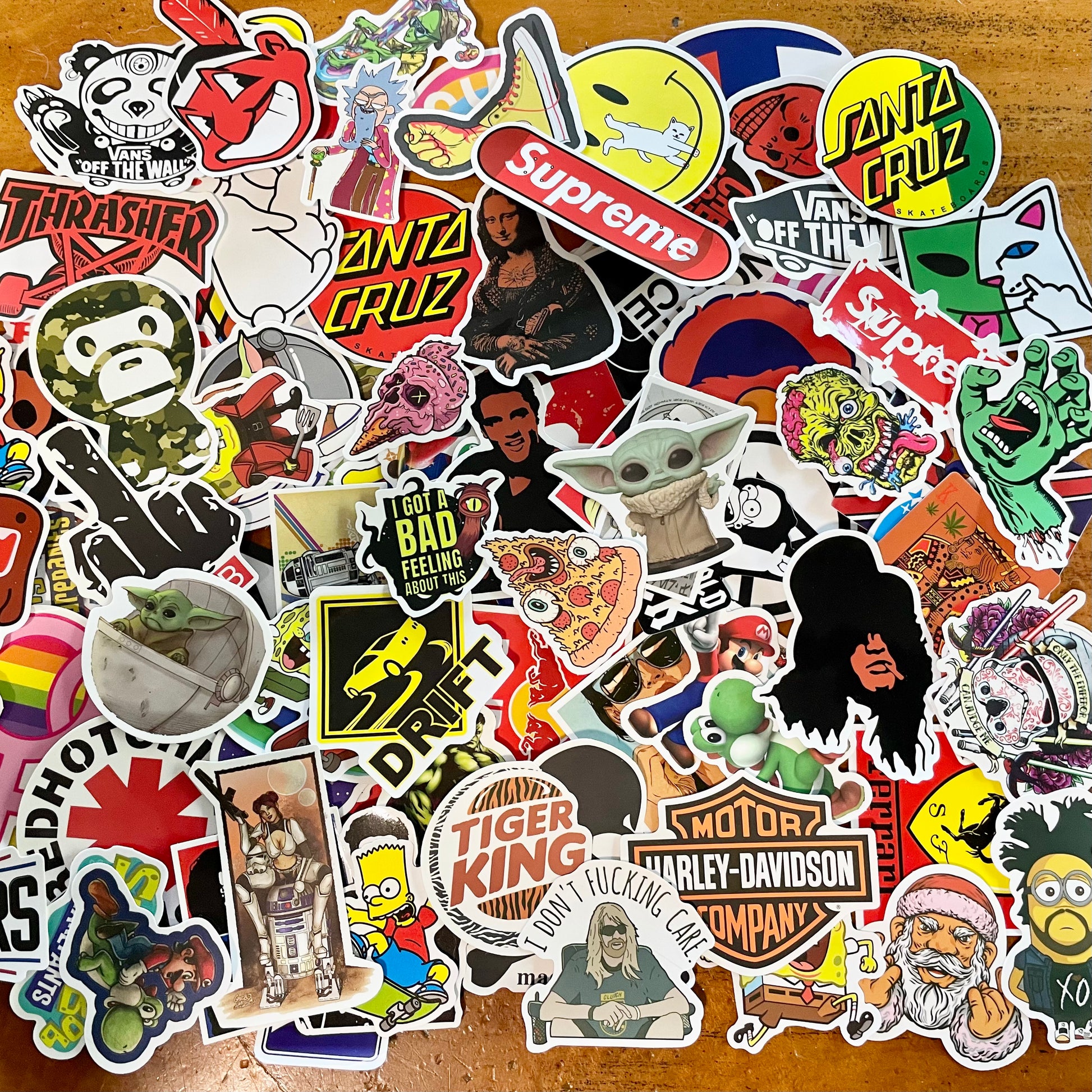 Stickers are from all sorts of genres like skateboard brands, rock bands, aliens, basketball, hip hop music, tv shows, cool logos, marvel, star wars, art, affirmations, animations, zombies, motorbikes, movies, cars, surfing, weed, video games, pretties, anime, comics, skulls, spoofs and other pop culture.... some stickers are naughty, some cute, some crazy.