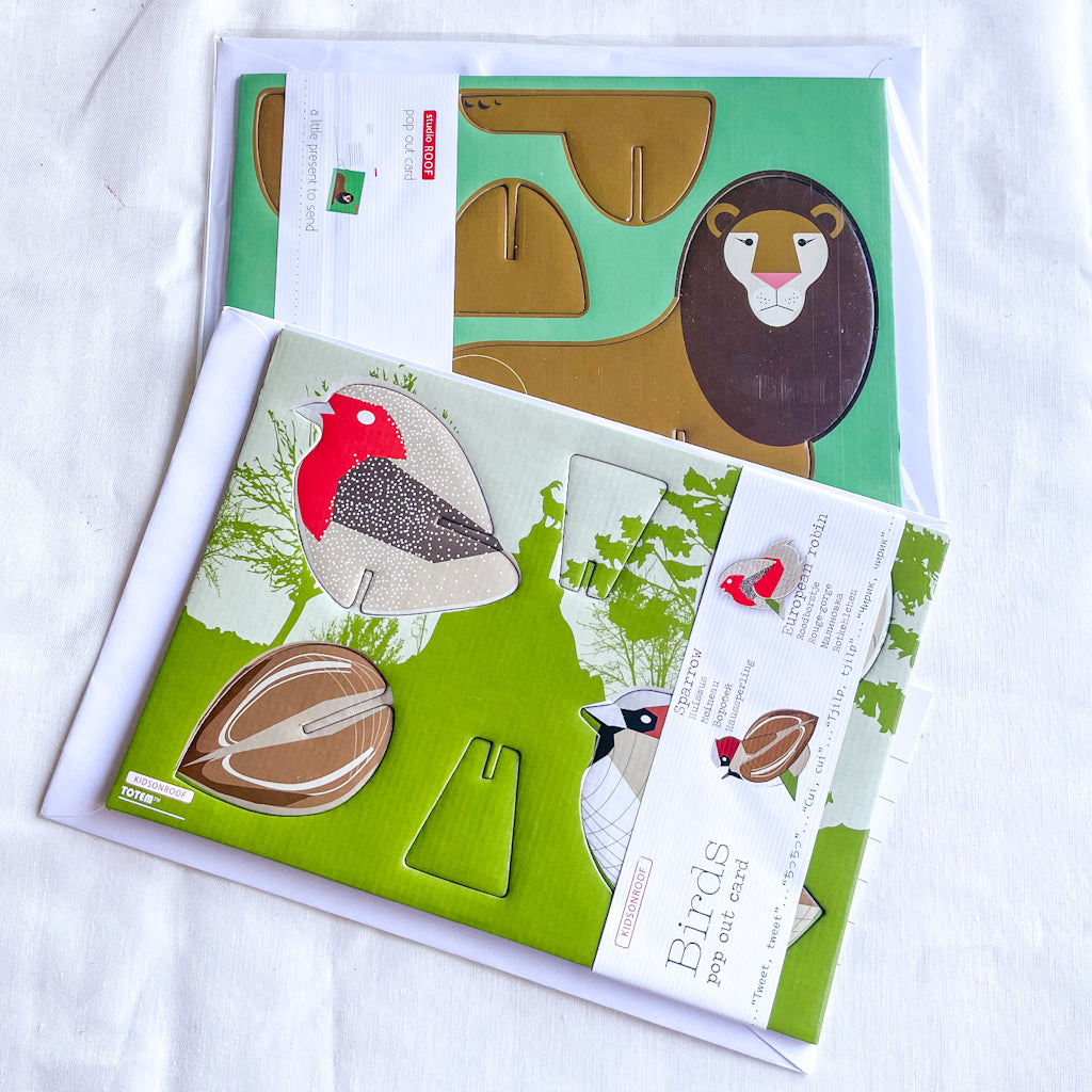 A pop-out card is more than a card, it’s a little present to send. This proud lion or bird couple can sit upon a table, window and can be used in many a game. Included is a Pop Out character, a card for the message, and an envelope. The receiver will get a beautiful message and a little craft activity too! It’s something to remind them of you every day and bring nature into their home with these beautiful creations.