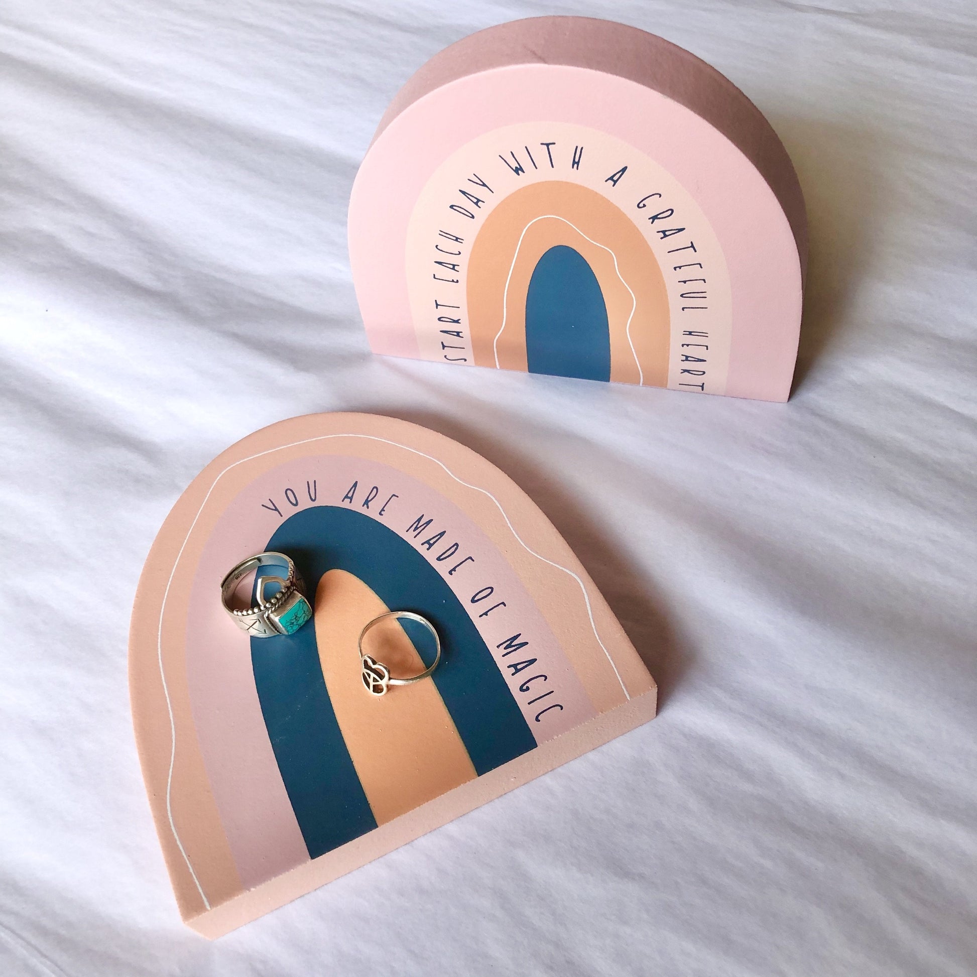 This rainbow will look perfect on your dresser as a display or as a trinket tray holding your rings. The perfect little gift idea. Great in a kids room!