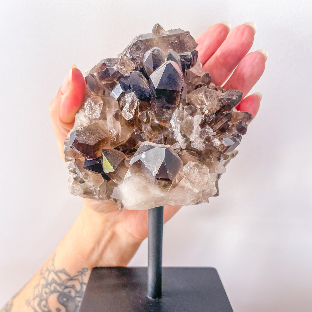 This XL smoky quartz crystal cluster on black metal stand is the perfect size for your office desk, bedside table, or lounge room shelf.