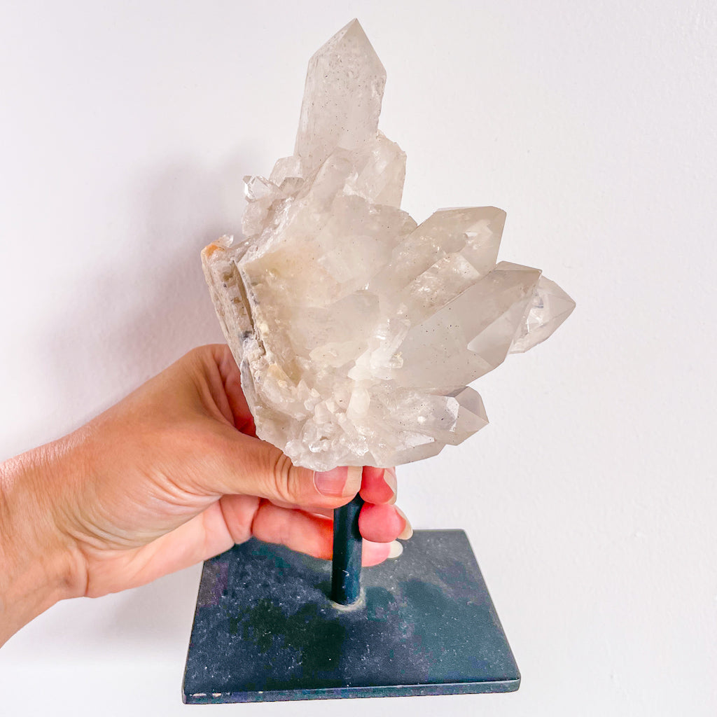 - Clear quartz crystal cluster on metal stand 19cm valued at $199.95