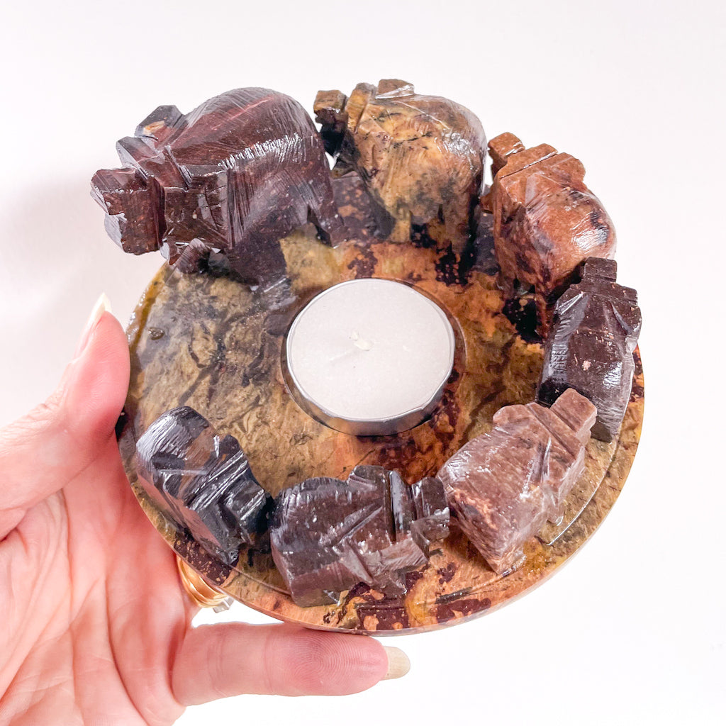 Elephant soapstone candle holder - powerful strong elephants use their mighty strength to remove obstacles and negative forces. They also represent family and community. Soapstone has a soothing, balancing effect while creating a positive, calming energy. This crystal candle holder is ideal for the dining room (or where ever you gather as a family to eat) to strengthen family connection and balance emotions.
