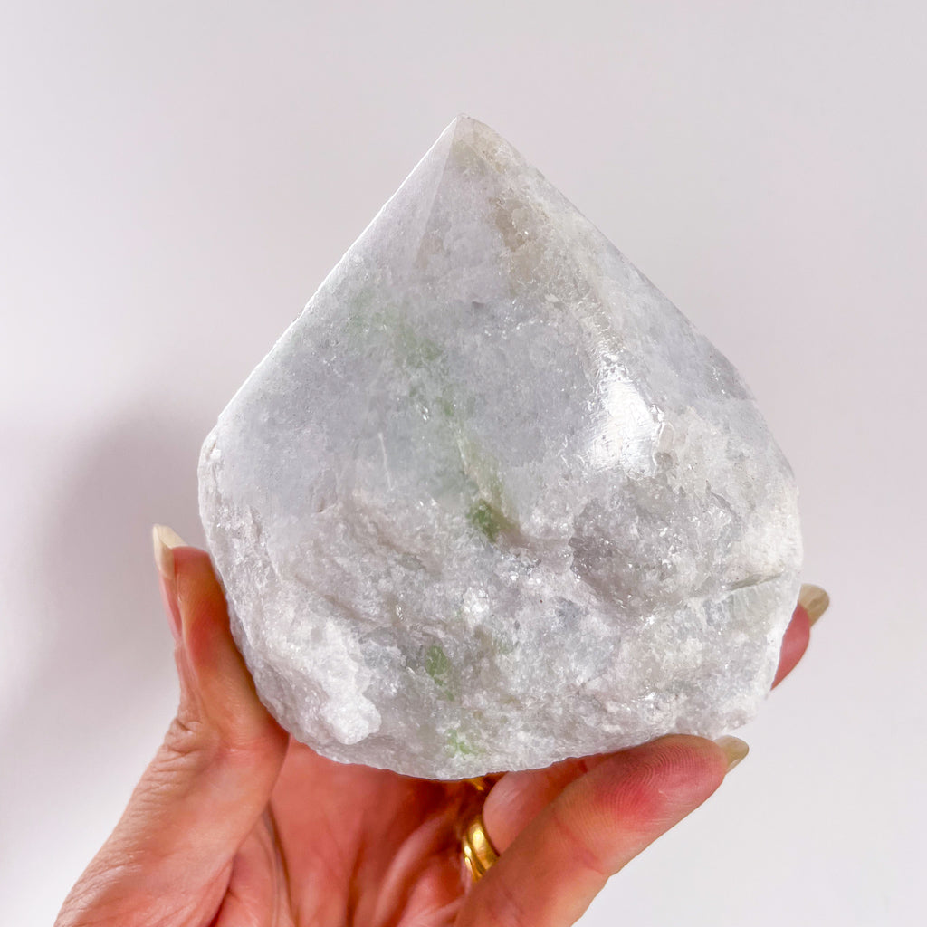 Blue calcite raw cut point - a stone of inner peace and communication. The calming blue represents the throat chakra and supports one to speak their truth while alleviating fear and insecurity. Crystal points are often used to direct and focus energies through the apex of a point. The crystal absorbs all the negativity and unwanted energy in your space, replacing it with positivity and light. This is the perfect crystal to place on a desk or in a work area like the kitchen.