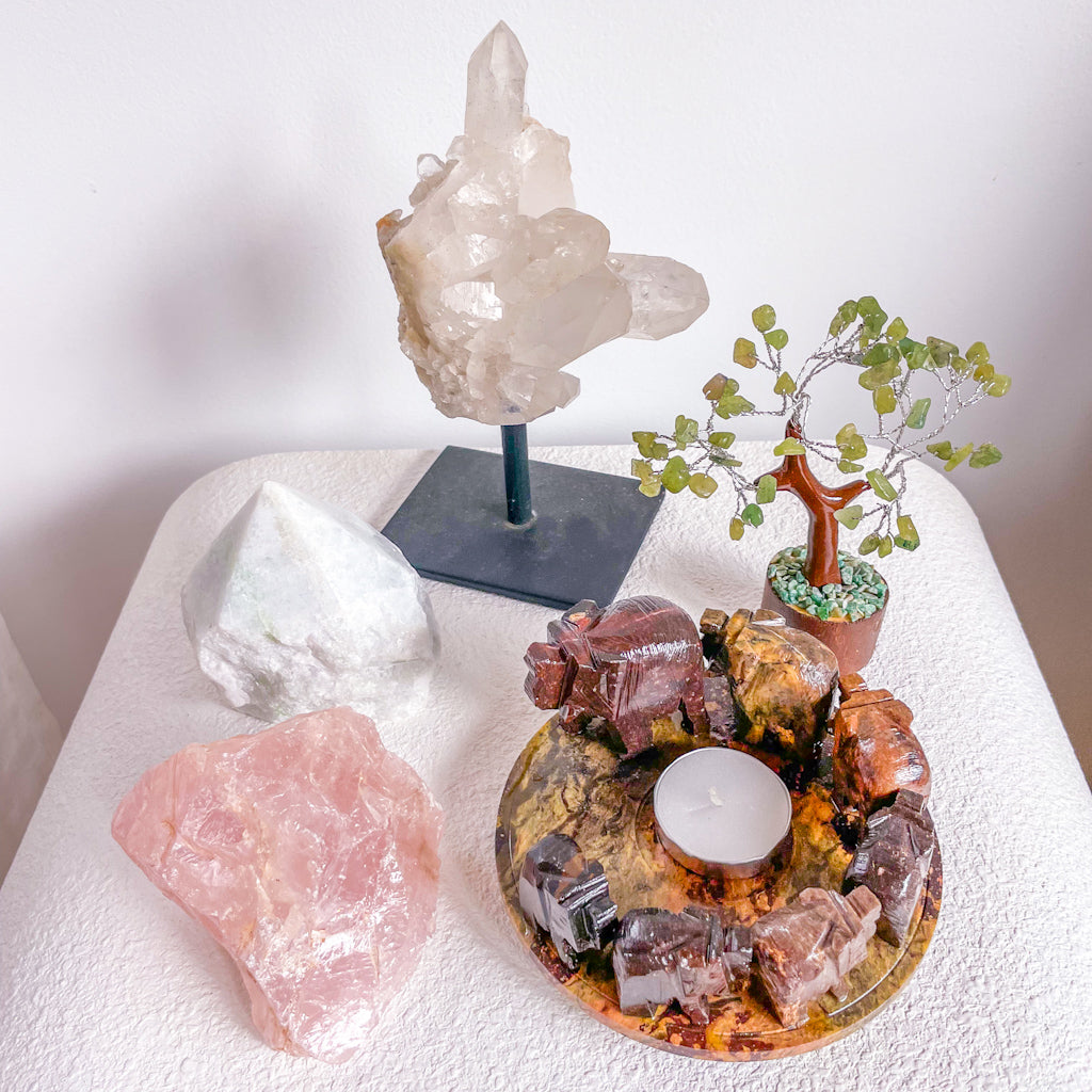 How to use your beautiful crystal set: situate the crystals around your house and workspace to assist in cleansing the energy throughout the room and promote positive vibrations.