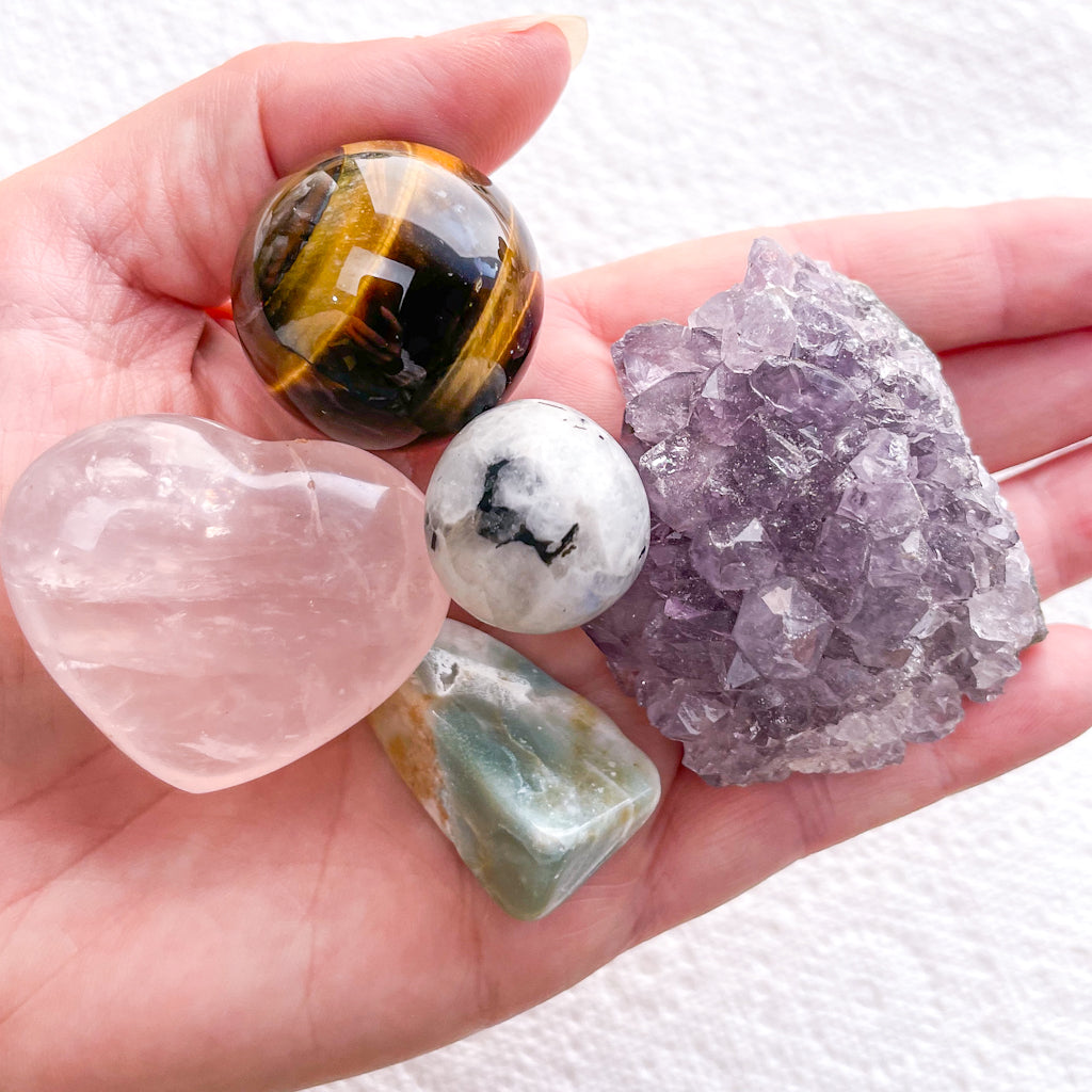 This crystal set includes 5 crystals: Rose quartz crystal heart, Tigers eye sphere, Amethyst crystal cluster, Amazonite tumble and Moonstone tumble.