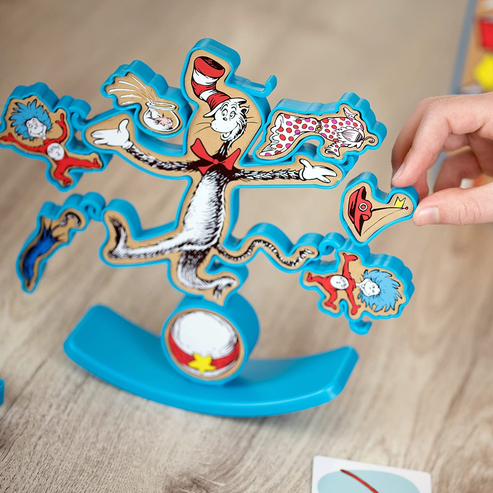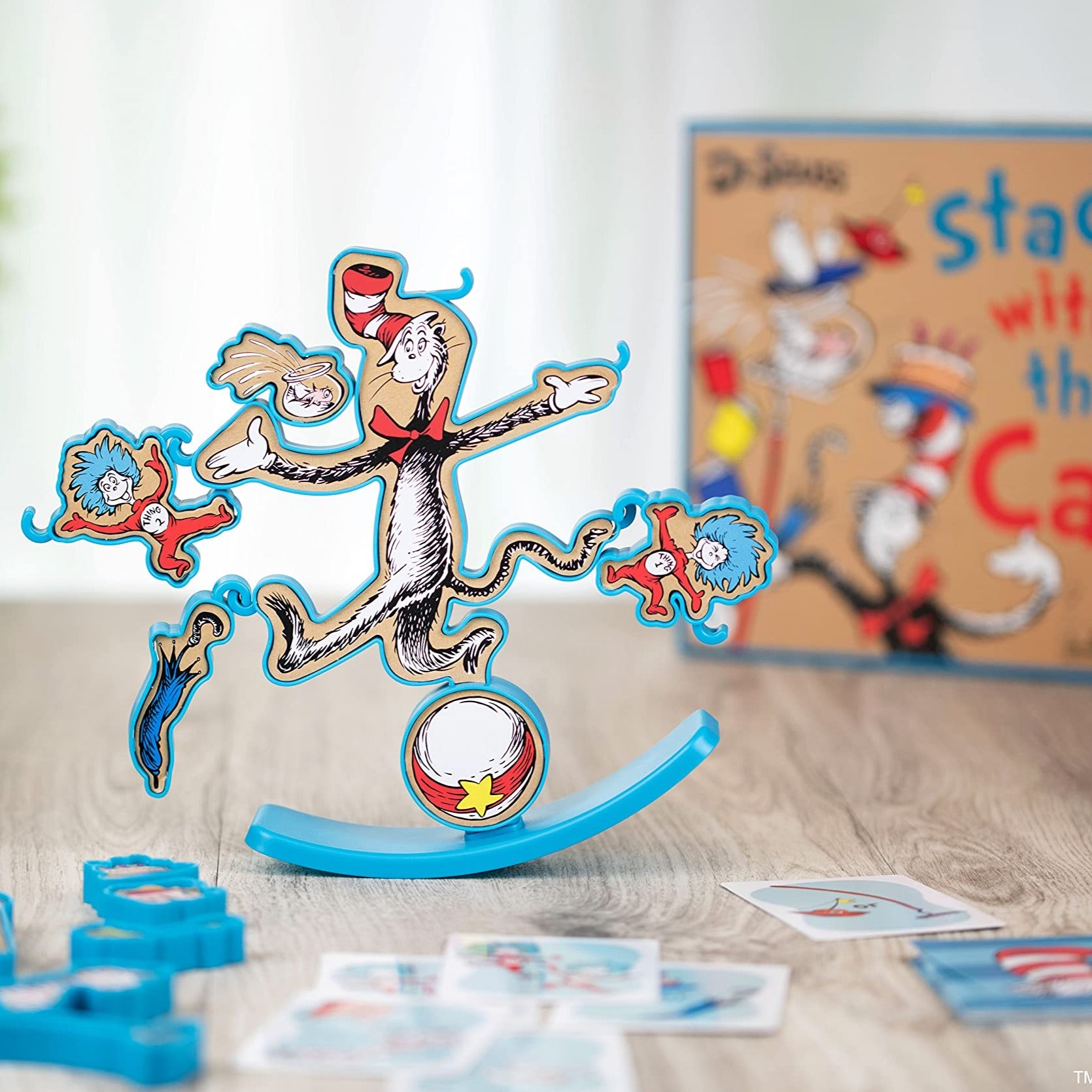 Dr Seuss Stack with a Cat Board Game in it a cold wet day and the cat in the hat has come to play! Stack the playthings one by one. But watch out—the cat is up on a wobbly ball, so don’t let all the playthings fall! Draw a card. Choose a plaything to stack on the cat in the hat. Be careful— don’t make the cat drop it all. Two modes of play, choose to play either cooperatively or competitively. Easy to set up and easy to clean up.Play with the beloved and classic literary character. For ages 4 years and up.