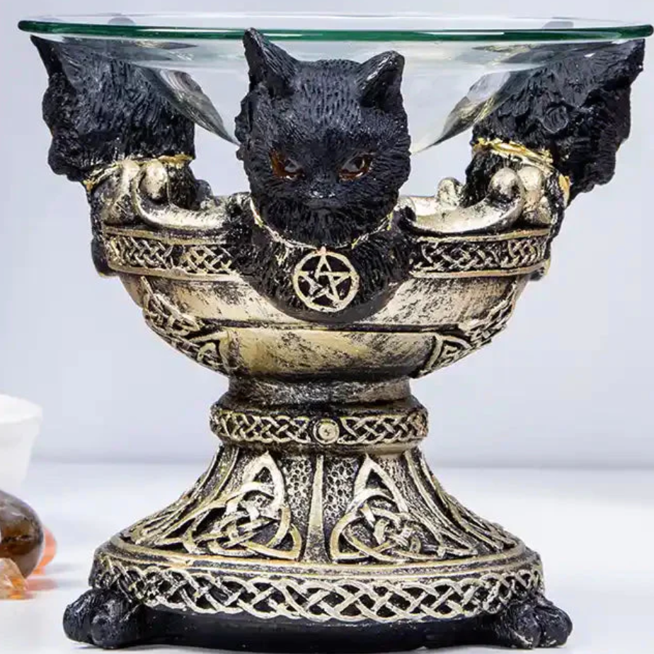 Burn your oils in this stunning oil burner shaped like a chalice with three black cats around the rim. Each cat has a lil pentagram collar to add a witchy vibe. This burner features a space to hold oil and wax melts, exquisite printed details and space to hold a standard sized tealight.