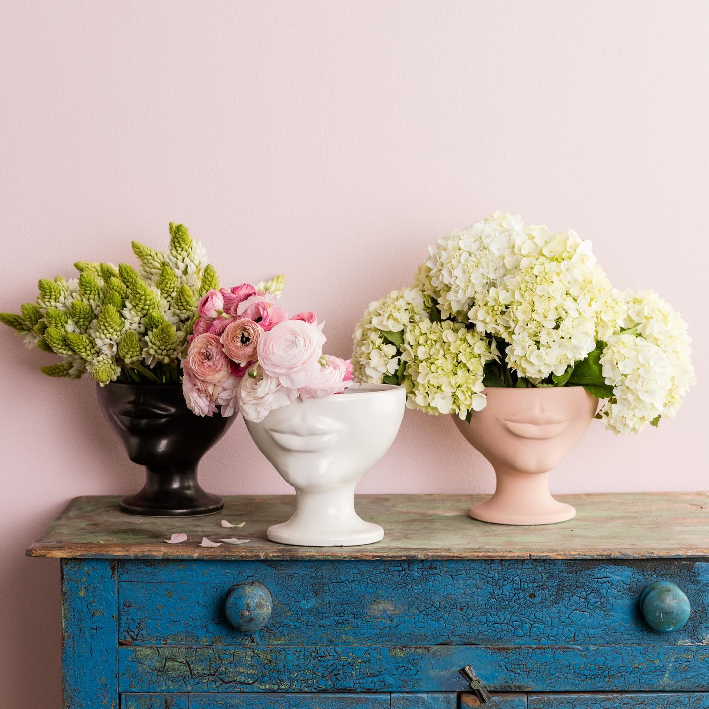 Our kiss planter / lips vase is available in white, black, light blue, green, honey brown, and pale dusty pink.