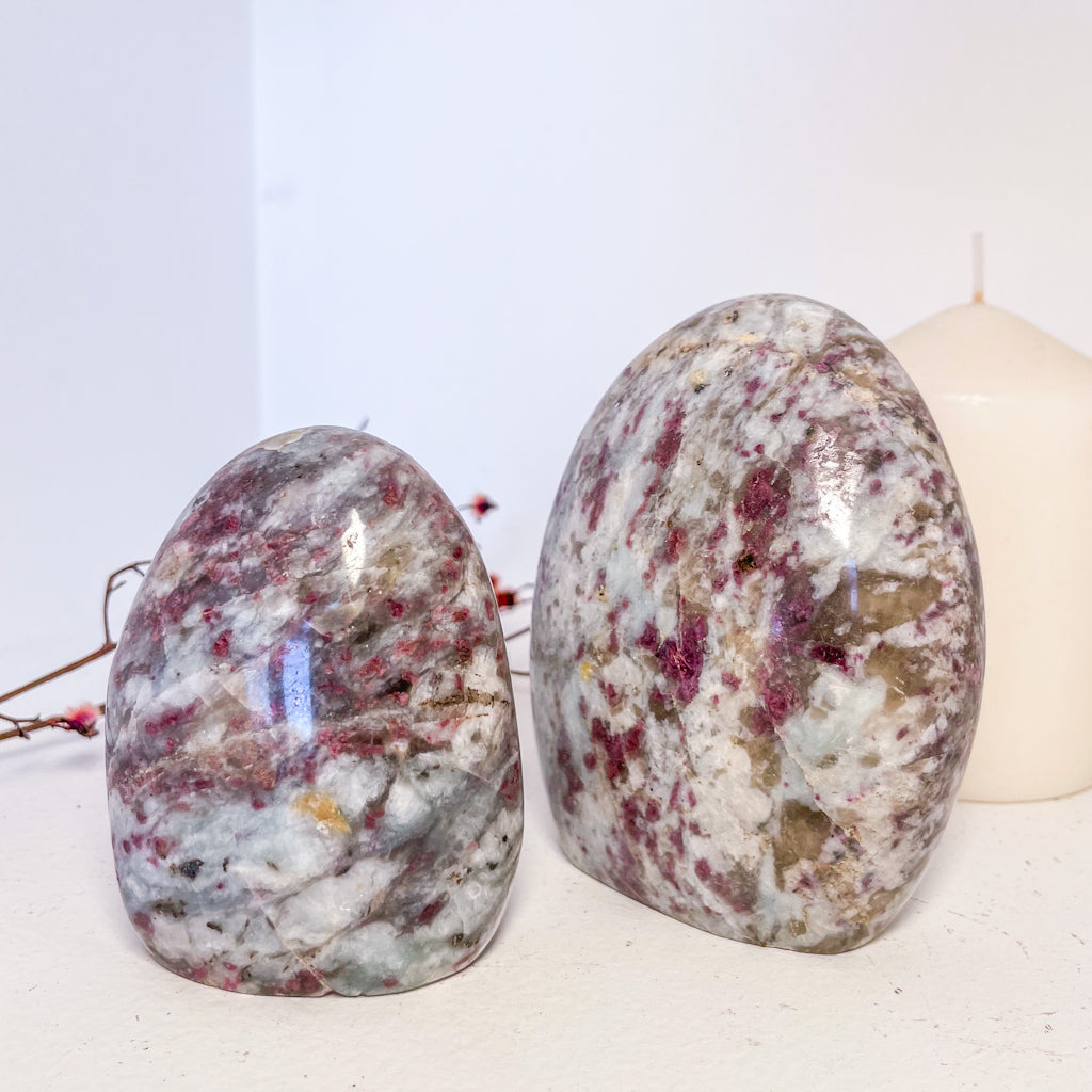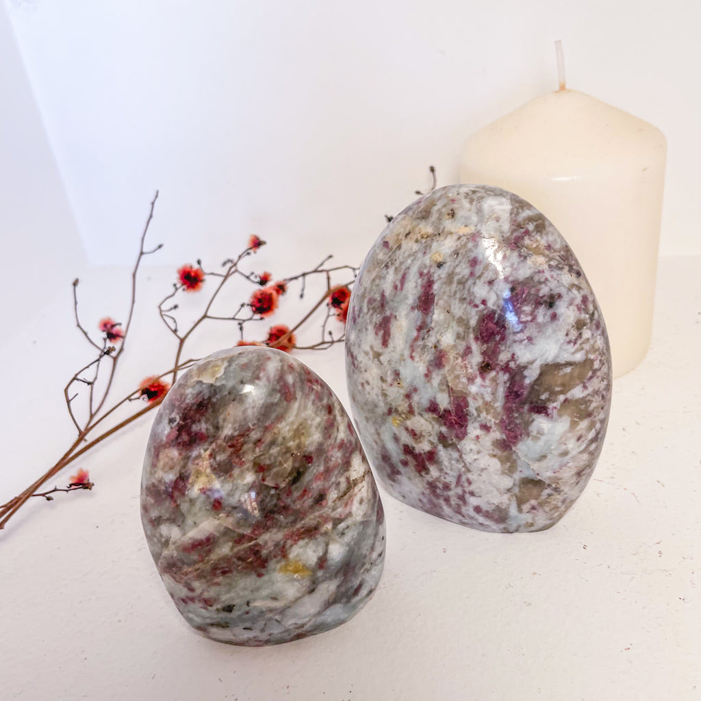 Unicorn Stone is a unique and recent find of Pegmatite from Madagascar. Its beautiful composition is of Pink Tourmaline, Lepidolite, Smoky Quartz, and Clevelandite. Bringing in calm, stillness, joy, empathy, positivity, and safety, Unicorn Stone helps us take that deep breath in to release the pent up fear, anxiety, and tension that we may be holding onto, and then keep moving forward with our heart open to what the world will bring us.
