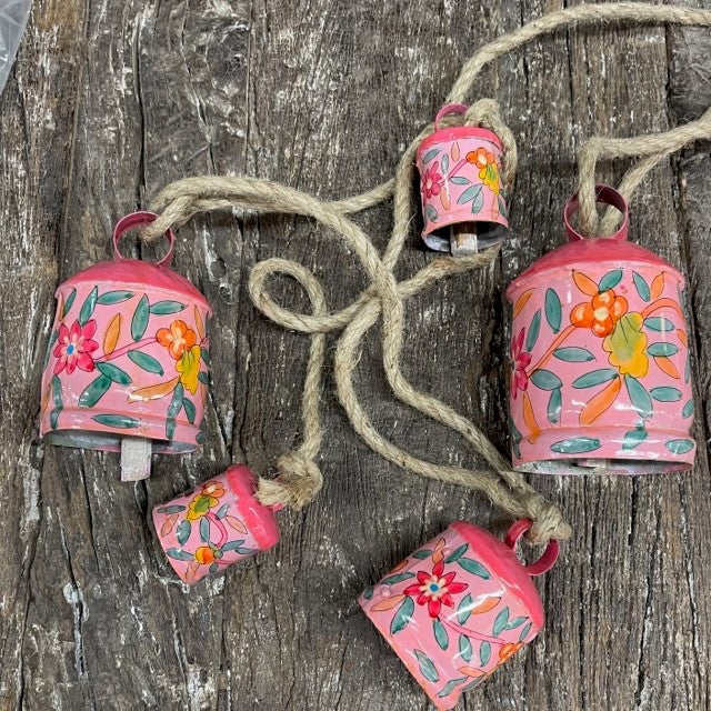 Purchase Vintage brass cow bell set 5 on rope floral pink online now from Six things shop Australia.