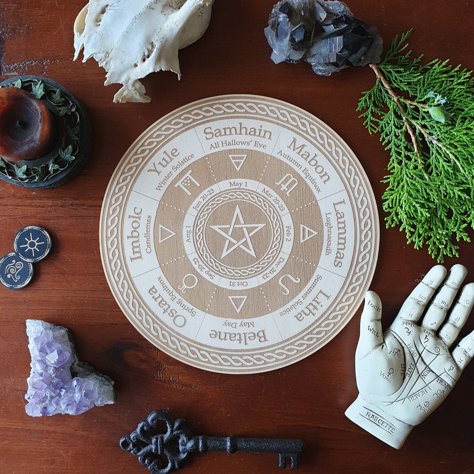 Wiccan calendar / witches annual wheel crystal grid wooden
