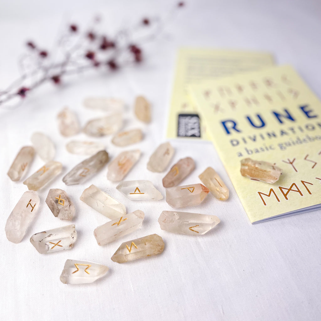 25 clear quartz stones, and optional book. Each set consists of 24 genuine clear quartz stones, each inscribed with a character from the Elder Futhark rune alphabet plus one blank stone. This set of clear quartz Rune Stones comes with a book of rune meanings.