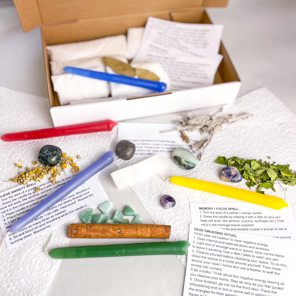 This wiccan gift box contains 10 spells and rituals with all the candles, herbs and crystals you need. Spells may include: Love spell, relieve anxiety spell, calming spell, peace spell, luck spell, happiness spell, memory spell, success spell, protection spell etc. Rituals may include: cleansing palo santo or sage smudging ritual, protection ritual, self love ritual, third eye ritual, water cleansing ritual and witches selenite etc.