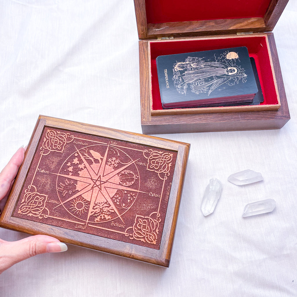 Keep your tarot cards, crystals, spell candles and other witchy things safe in this Wiccan Calendar Tarot Storage Box.