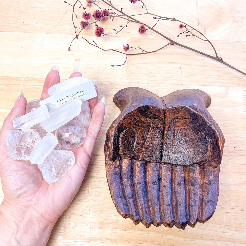 Looking for a divine way to keep your crystal or jewellery handy? These rustic wooden offering bowls - prayer hands / giving hands are beautiful go to. The open palms of the hands representing both giving and also receiving of energy. Used a a gorgeous decor piece atop your altar, they also make a great offering bowl.