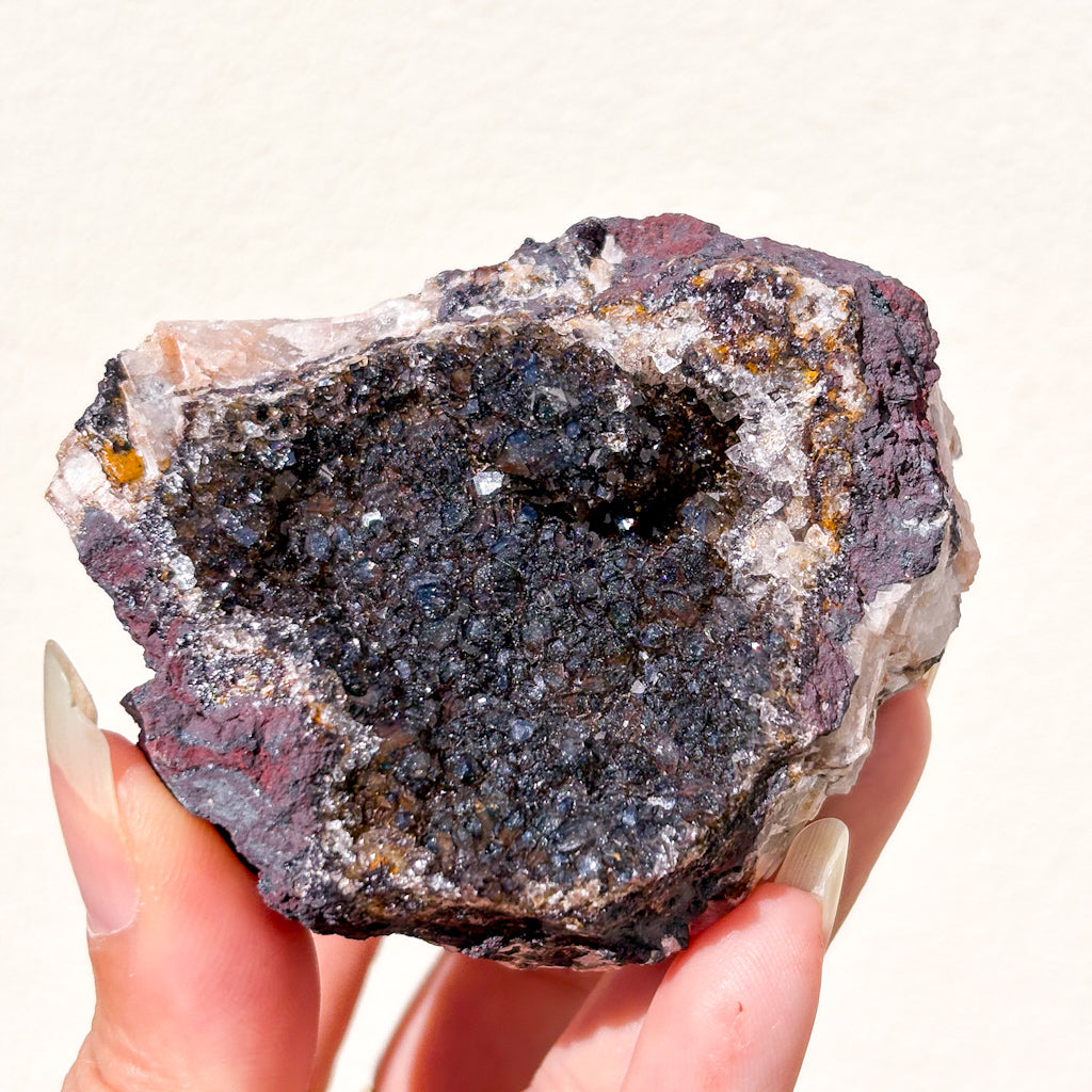 Sourced from Morocco, this manganese quartz cluster features a deep, rich burgundy brown finish with a subtle sparkling shine. Its earthy tones and natural shimmer make it a unique and eye-catching piece.