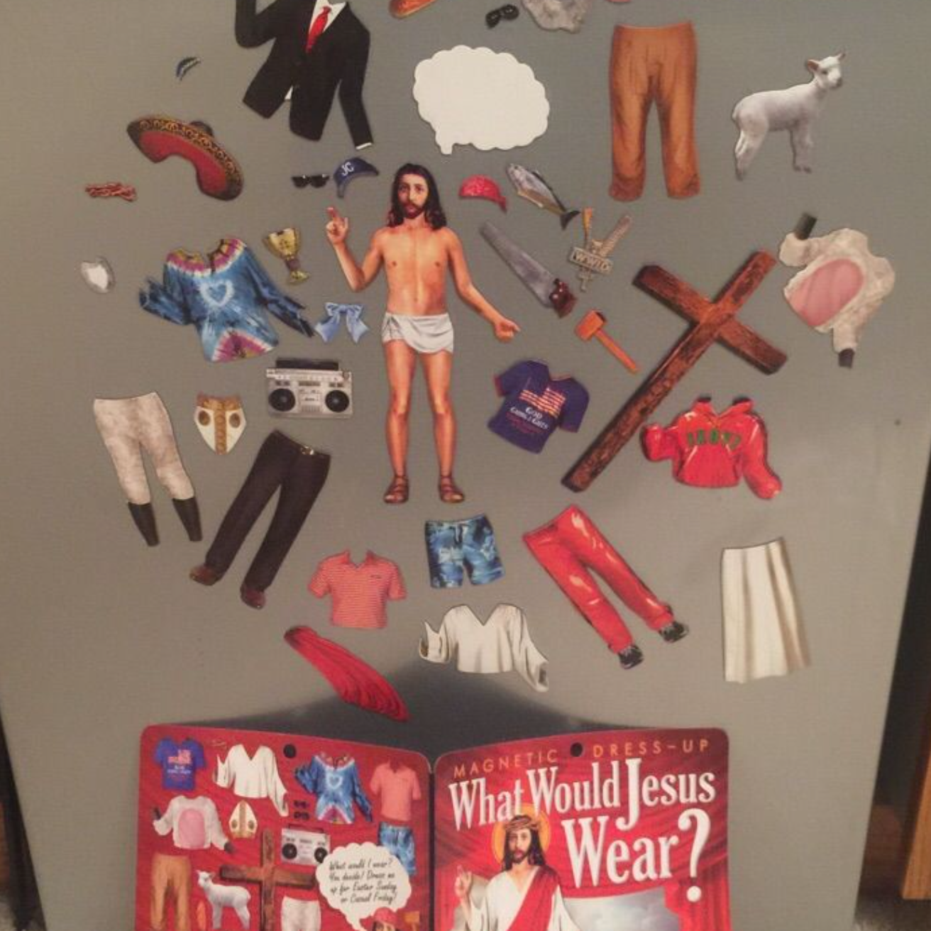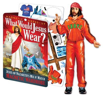 We like to think Jesus would get a kick out of this What Would Jesus Wear Magnetic Dress Up Kit. It features a large magnet in the likeness of Jesus and a large assortment of magnetic clothing and accessories. You can dress Jesus in anything from traditional garb (white robe, cross) to surfer dude (tie-dyed shirt and surfer shorts). There are also loads of props such as loaves, fishes, chalices, hats, and tools from his carpenter years.